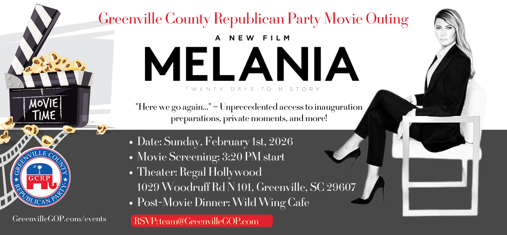 Join the Greenville County Republican Party for a Movie Outing – we’re gathering to experience MELANIA, the highly anticipated documentary directed by Brett Ratner. This intimate, behind-the-scenes film offers unprecedented access to First Lady Melania Trump’s world during the pivotal 20 days leading up to the 2025 presidential inauguration. Through exclusive footage of critical meetings, private conversations, and never-before-seen moments, it provides a rare glimpse into her orchestration of inauguration plans, the complexities of the White House transition, and her graceful return to public life alongside her family. Following the film, we’ll continue the conversation over casual dinner.
