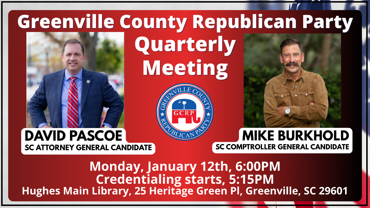 Join the Greenville County Republican Party at our next Quarterly Meeting on Monday January 12th, 2026