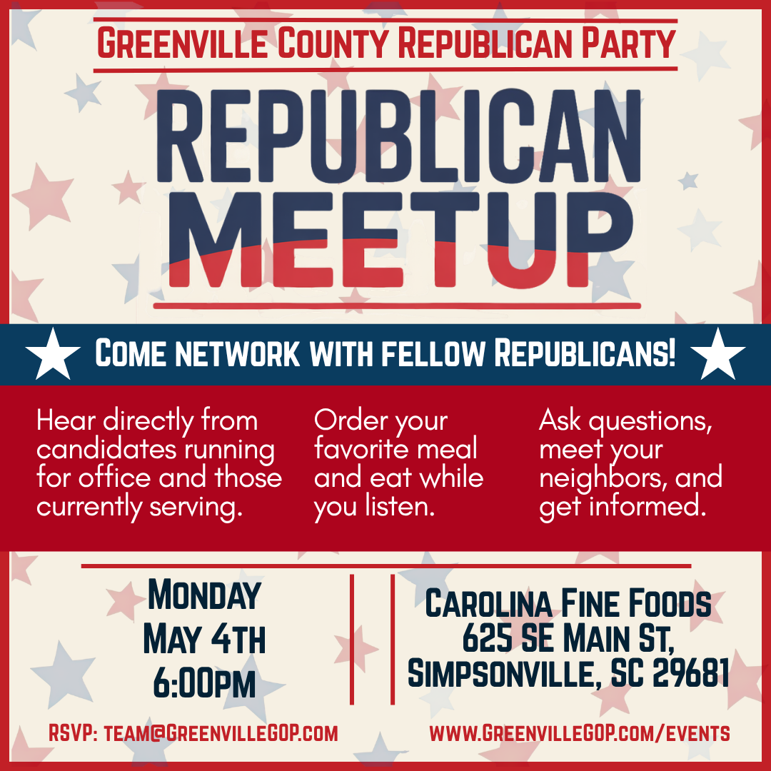 Join us for a Republican Meetup in Simpsonville! Meet & greet the candidates, network with fellow Republicans.