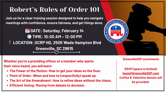 Don’t let the next meeting be a heartbreak, learn the rules and lead with confidence. Space is limited: please RSVP at team@GreenvilleGOP.com