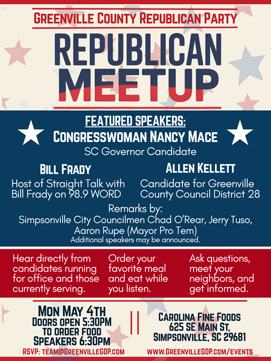 Join us for a Republican Meetup in Simpsonville! Meet & greet the candidates, network with fellow Republicans.